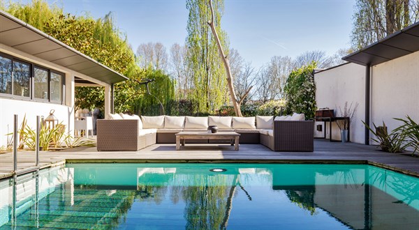 • Piscine moderne en rooftop avec coin repas